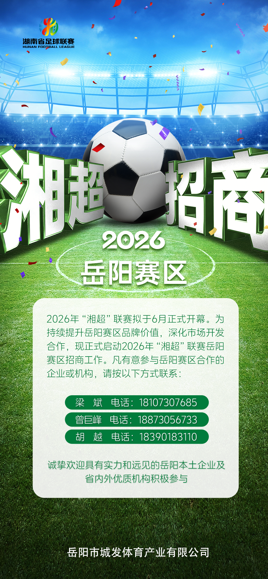 时光向前,热爱不减。2026年 “湘超” 联赛拟于6月再度启航,岳阳赛区将再度以洞庭之滨的豪迈、巴陵古城的热忱,迎接这场万众瞩目的体育盛会。为持续擦亮 “湘超” 联赛岳阳赛区的金字招牌,让千年古城的人文底蕴与足球运动的热血激情碰撞出更耀眼的火花,进一步深化市场开发与多方合作,将赛事影响力转化为城市发展的新动能,2026年“湘超” 联赛岳阳赛区招商工作今日正式启动!
